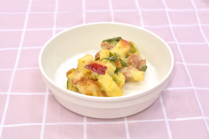 じゃが芋に、ほうれん草とりんごを組み合わせて「かき揚げ」にするという意外性のある組み合わせが新鮮で、子どもにとっても食べやすい工夫が感じられる一品でした。