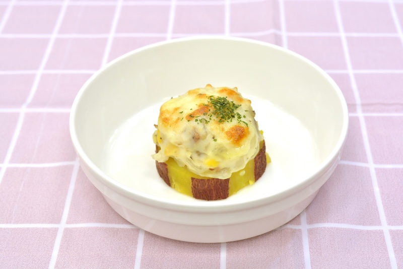 ⑥ さつまいもの上にディッシャーを使用して⑤をこんもりとのせる。