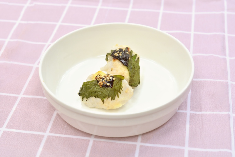 ⑥ ⑤を20gずつ(1人分40g)形を整え、大葉で包んで、油を薄く塗る。の味噌ダレを塗り、ごまをかける。