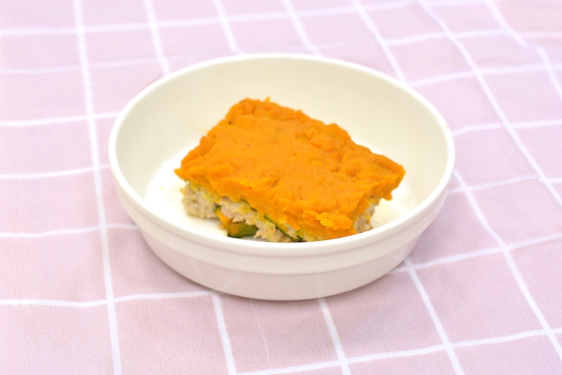 ⑤ バットにクッキングシートを敷き、南瓜Bを敷き詰め、④をいれて180°Cのオーブンで10分焼く。